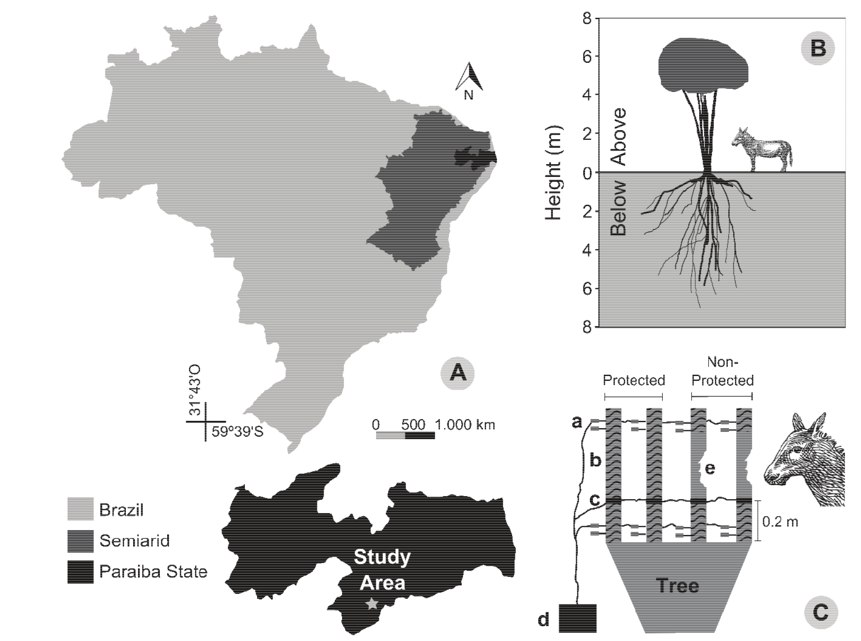 The study was carried out in Semiarid area (BSh, Köppen-Geiger classification) (Peel, Finlayson, & McMahon, 2007) (Figure 1A), with significant presence of Poincianella pyramidalis. This species has 60% of amplified importance value (AIV = sum of relative frequency, relative density, relative dominance, sociological position and natural regeneration) (Finol, 1971). In this area (7°49’25”S and 36°32’57”W), the density of P. pyramidalis individuals was 801 ind ha-1 of a total of 1,818 ind ha-1, all individuals with circumference at the base greater than 9 cm and total height greater than 100 cm (Rodal, Sampaio, & Figueiredo, 1992). Two areas were studied, one hectare each, denominated Control Area and Experimental Area. These areas are near 300 meters, and they were divided in 20 subplots of 0.05 ha (without physical limits). All areas occur on Yellow Oxisol 1 (LAx-1), with environmental mean annual temperature of 29°C, approximately, annual rainfall of 650 mm, approximately, and vapor pressure deficit of 1.4 kPa, approximately (mean from April 2000 to April 2015) (Instituto Nacional do Seminário [INSA], 2015). In Experimental area, from 2006 to 2010, presence of E. africanus asinus was permitted with density of 28 ind ha-1 (Figure 1B), all delimited by fencing.