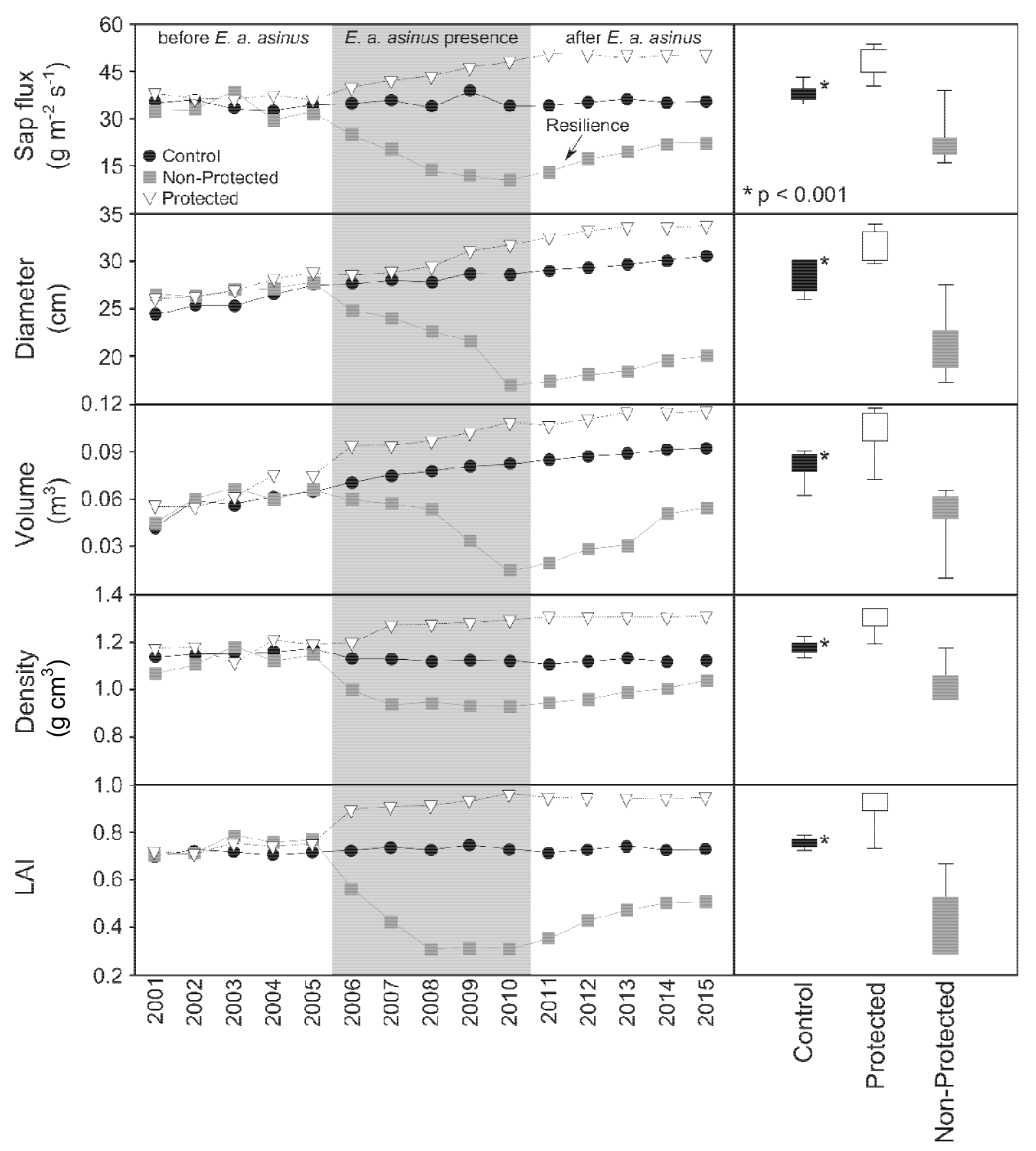 All data in each sample group of the studied variables had normal distribution (p < 0.001). The results of the dendrophysiological variables showed significant effects (p < 0.001) of the presence of E. africanus asinus on P. pyramidalis population (Figure 2). In the beginning (from 2001 to 2005), the values of variables showed no significant differences (p > 0.05) between the three studied sample groups. In E. africanus asinus presence (from 2006 to 2010), values of the dendrophysiological variables reduced in non-protected branch and increased in protected branch in the same tree individual, differently from branch in the control area (Figure 1). From 2011 to 2015, in non-protected branches (without the presence of E. africanus asinus), values of the studied variables increased, indicating the resilience of the species. In protected branches, values of sap flow, density and leaf area index (LAI) were stable over time (from 2011 to 2015), and diameter and volume values increased. All values of variables in protected branches of the experimental area were higher than in control areas (p < 0.001, from 2006 to 2015).