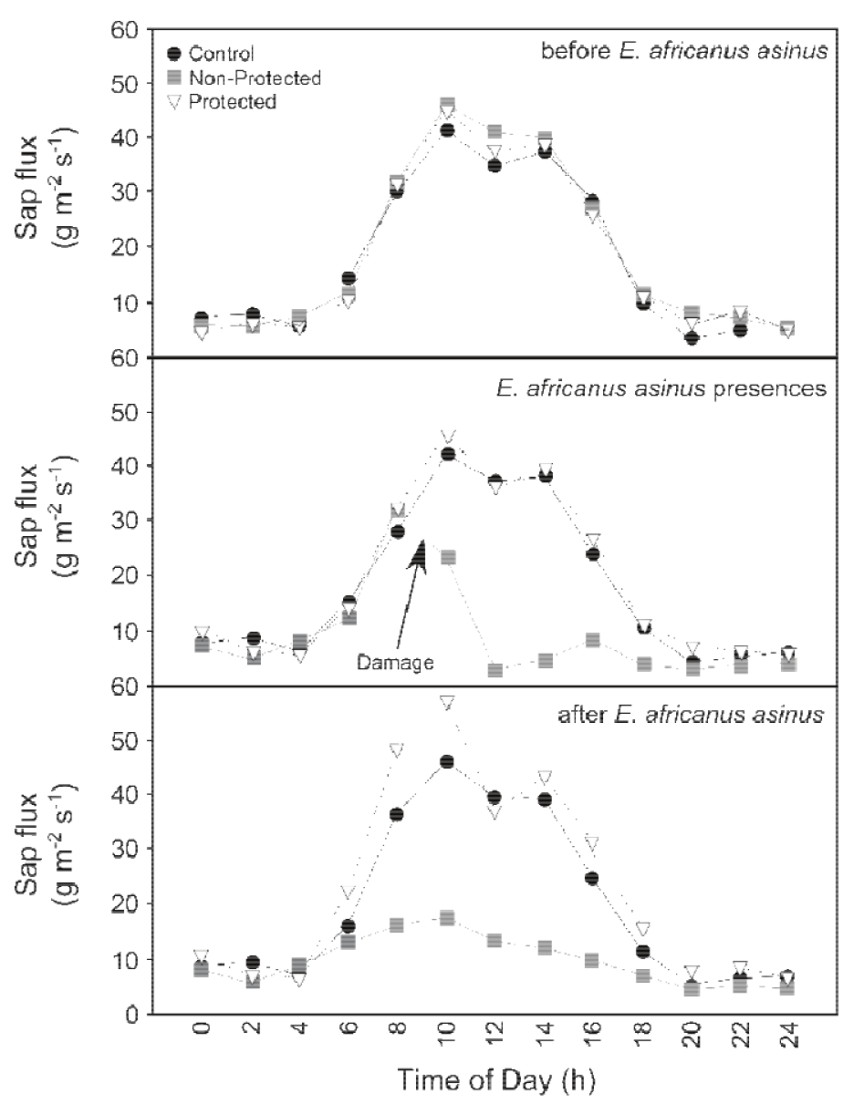 The reduction in sap flow values was observed (p < 0.001) immediately after damage caused by E. africanus asinus (Figure 3). With the presence of E. africanus asinus, in non-protected branches, there was sap flow but with lower value than that observed in control area. In this same time, the protected branches increased the sap flow values (Figure 3).