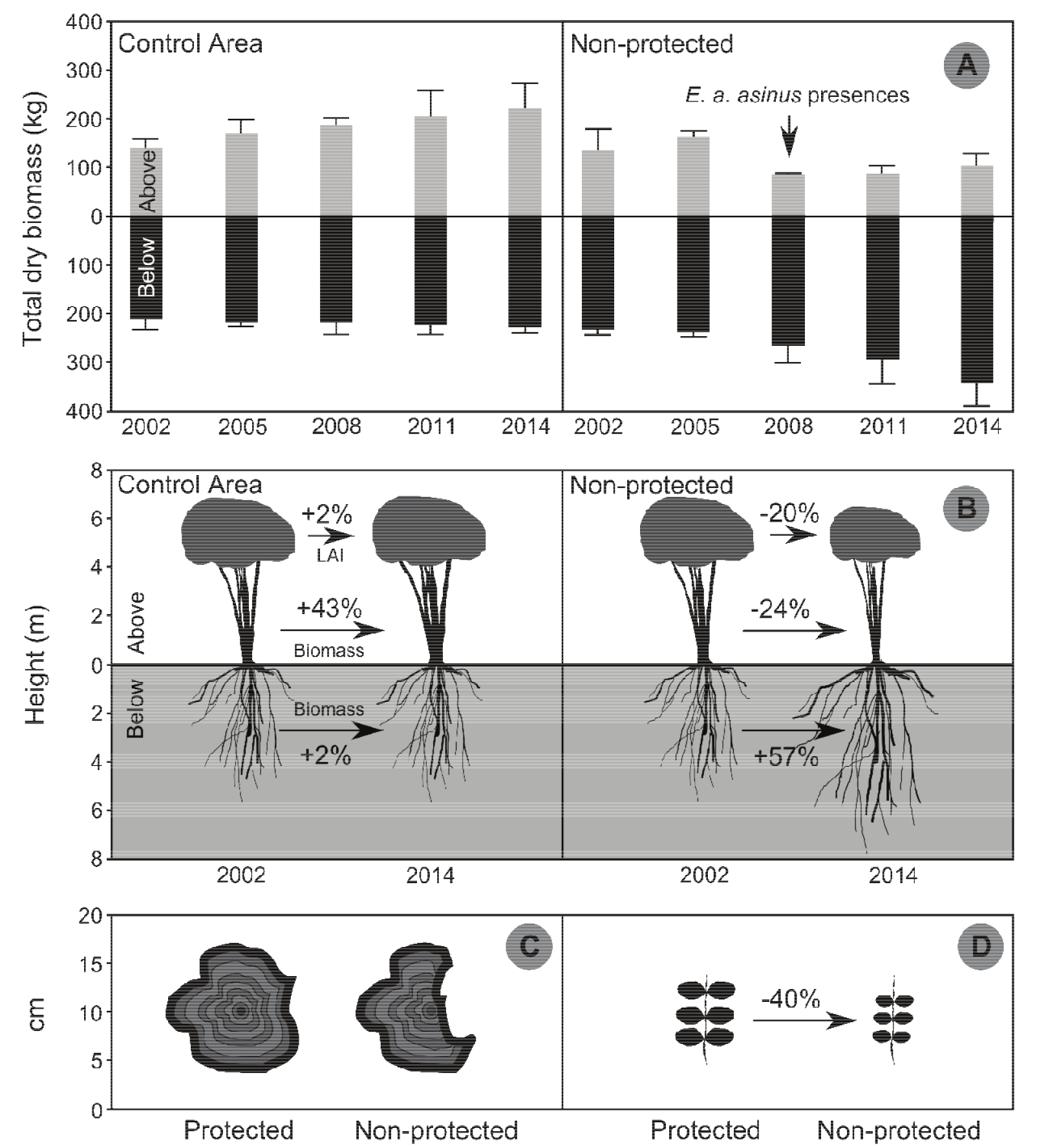Dry biomass of P. pyramidalis increased aboveground (43%) over time (p < 0.001, from 2002 to 2014) and the values of belowground were stable, without significant increase or reduction (p > 0.05, from 2002 to 2014) in control area (Figura 4A and B). In experimental area, the dry biomass aboveground had a reduction (-24%, p < 0.001, from 2002 to 2014), mainly in 2008, with the presence of E. africanus asinus. From this year on, dry biomass values began to increase significantly (57%, p < 0.001, from 2008 to 2014). Damage caused by E. africanus asinus did not exceed 35% of basal area of the branch (Figure 4C). When the damage reached 35%, E. africanus asinus individuals searched for another tree individual for herbivory. Other observation was the reduction (-20%, p < 0.001, from 2002 to 2014) in leaf area index, in branches of the experimental area, and in the leaf area (-40%, p < 0.001, from 2002 to 2014) (Figure 4D).