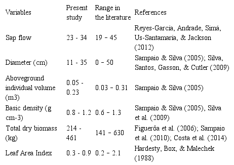With these ecological interactions and ecophysiological strategies (survival strategies), P. pyramidalis individuals are frequent and dominant (amplified importance value > 50%) in semiarid northeastern, as also found in a survey in permanent plots in the Caatinga (Silva, Lopes, Lopez, Melo, & Trovão, 2014; Santos, Santos, Silva, Araújo, & Araújo, 2016) and in this work. Thus, the species is considered as a bioindicator for ecosystem management and conservation (Souza, Menezes, & Artigas, 2015). In this study, the ecophysiological strategies (reduced sap flow and leaf area index) are short-term strategies to endure animal attack; however, the increase in root biomass indicated a strategy for survival (long-term) of the individuals and the species. It is clear that when tree individuals did not need to invest in increasing root biomass (control area); the tree individuals did not invest.