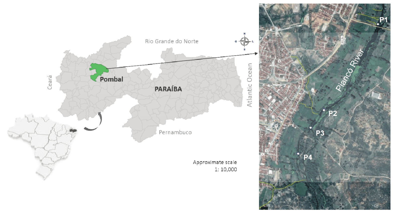 Current analysis was performed in the hydrographic basin of the River Piancó (Figure 1), or rather, in the stretch which margins the urban area of the municipality of Pombal (888.8 km²), with approximately 32,712 inhabitants, in the western region of the state of Paraíba, Brazil, within the geo-environmental unit of the Hinterland Depression in a typical semi-arid landscape (Instituto Brasileiro de Geografia e Estatística [IBGE], 2015).