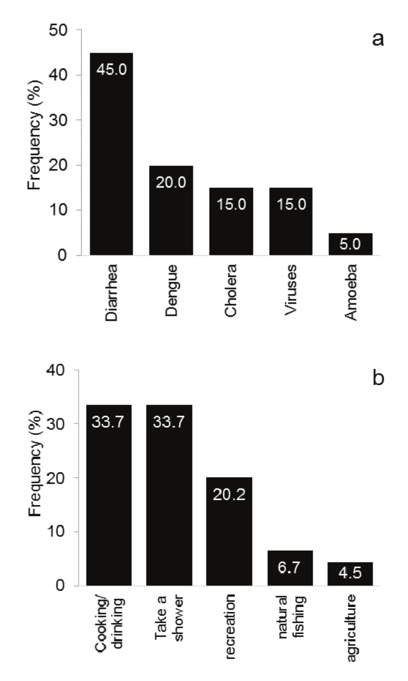 Further, 93.3% (n = 28) are aware that a polluted river has negative effects on health since there is a high dissemination of diseases. Only a small section, 33.3% (n = 10), acknowledges that diseases may be transmitted by using inadequate water. Moreover, 69.2% (n = 9) of the people who were aware of diseases transmitted by improper drinking water mention diarrhea as the most common (Figure 2a).