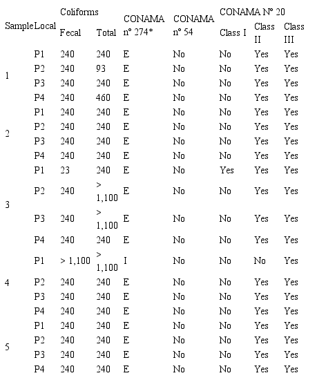 According to CONAMA Resolution 20 (CONAMA, 1986), only two samples for total coliforms at Sites P2 and P3 and one sample P1 respectively for collections 3 and 4 could not fit in Class 1 water, for total and fecal coliforms, or rather, those for home supply, for the protection of water communities, for primary recreation and irrigation of vegetables.