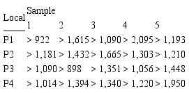 In the case of E. coli counts, great variability was reported between the sites or collection peRiods, namely, between >898 (P3) and > 2,095 UFC 100 mL-1 (P1), with no site having higher rates among the others (Table 3). According to CONAMA Resolutions 274 and 54 (CONAMA, 2000b and a), all samples were improper for swimming and exceeded the limit 800 UFC/100 mL (Table 3).