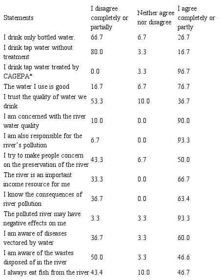 Even though the consequences of contaminated water are evident, 36.7% (n = 11) do not know the consequences that river pollution may cause. However, 60.0% (n = 18) are sure that home wastes are disposed of in the river, worsening still an already bad situation.