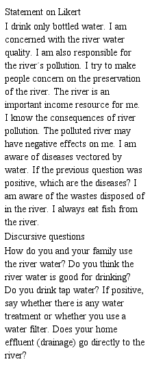 Research was also based on a social-environmental assessment by applying a structured questionnaire to inhabitants that live close to the margins of the River Piancó. Sampled population was estimated, following Rocha (1997) and thirty homes were interviewed where one member answered the questionnaire. All items were related to consumption and to the social and environmental attitudes of the inhabitants with regard to the use of water, especially the water of the River Piancó (Table 1).