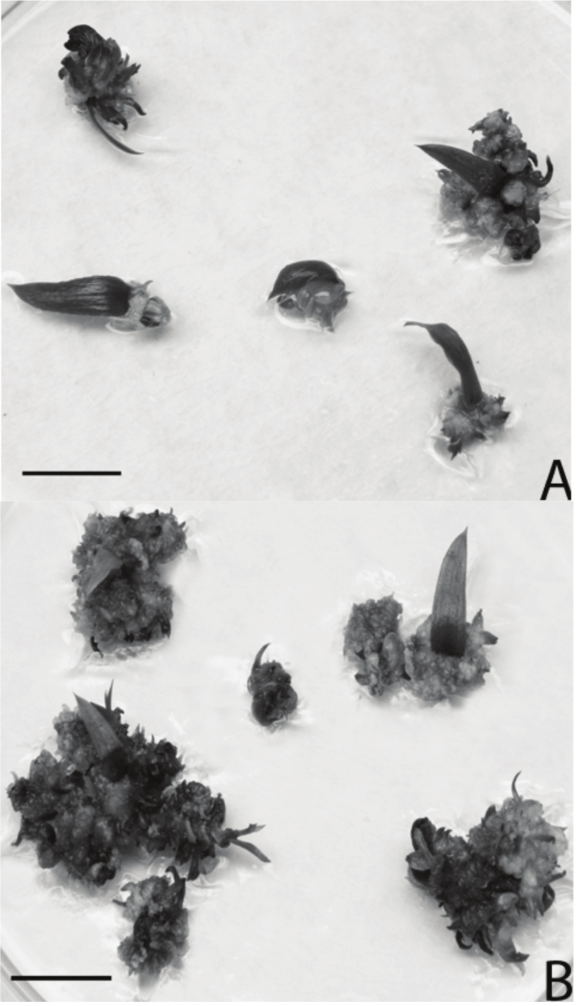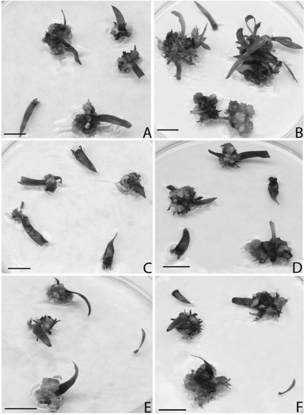 Leaves of approximately 1 cm in length were removed from seedlings derived from in vitro germination after 42 days of culture and inoculated with the abaxial surface in contact with the medium. The MS medium used was supplemented with different combinations of the plant growth regulators (PGR) naphthaleneacetic acid (NAA) (0, 1 or 2 μM) and 6-benzylaminopurine (BA) (0, 2, 4 or 6 μM). The conditions of the culture room were the same as previously mentioned.