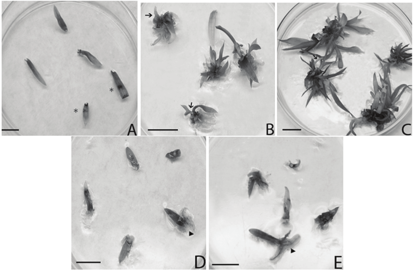 In this work, it was possible to establish, for the first time, a protocol to the induction of shoots from B. euphemiae leaf explants. The organogenesis was only observed in the base of the leaf explants, in response to NAA and BA, probably because of the activation of competent cells to the dedifferentiation, which highlights the morphogenic potential of this region. Moreover, as the production of shoots occurred by direct organogenesis, the usage of leaf explants to the micropropagation of B. euphemiae can also be considered as a complementary strategy to the in vitro multiplication and conservation of this species.