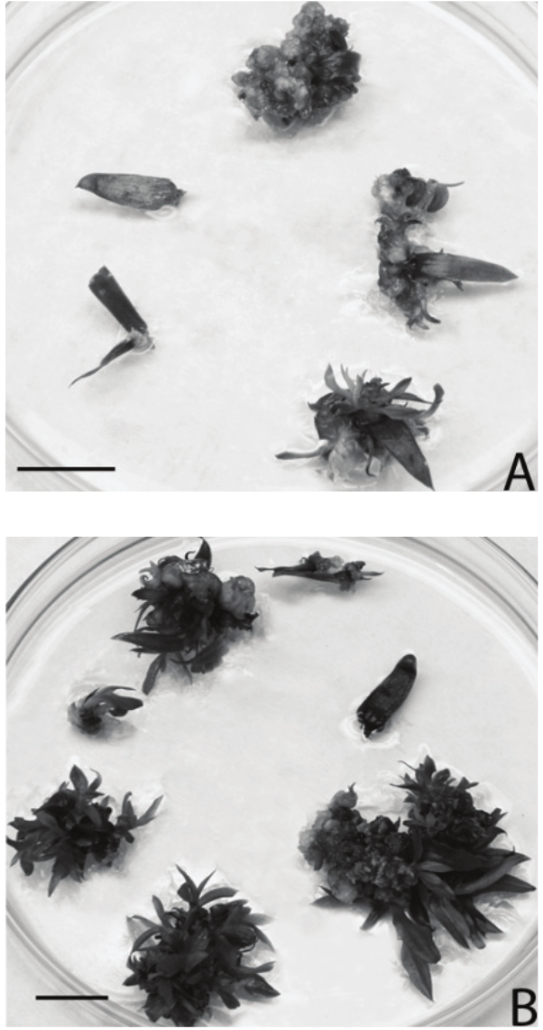 Moreover, Pierik, Steegmans and Hendriks (1984) reported that the addition of NAA in the MS culture medium, in concentrations among 2.6 and 4.2 μM, efficiently promoted the growth and rooting of the shoots of three different bromeliad species (Guzmania minor, G. lingulata and Vriesea splendens). In this work, the endogenous concentration of cytokinins in the B. euphemiae leaf explants probably was sufficient to promote a hormonal balance with the auxin present in the culture medium and to stimulate the observed morphogenic responses. This can be justified by the fact that the highest number and longest length of the shoots were observed using only 1 μM of NAA.