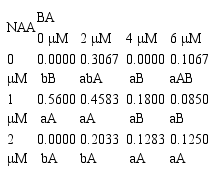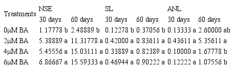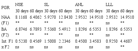 The results of the analysis of variance showed that the NAA and BA factors only had presented significant interaction in the LLL variable after 60 days of culture (Table 1). For the other parameters (NSE, SL and ANL, after 30 and 60 days, and LLL, 30 days) we did not observe significant interaction between the two tested factors.