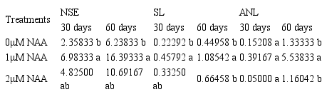 The NAA effect on the NSE, SL and ANL variables is represented on Table 2. The best results for NSE were observed after 60 days in the concentrations of 1 μM (16.39 shoots) and 2 μM (10.69 shoots) respectively, although they did not show statistical differences between them and the 2 μM concentration did not differ from the control.
