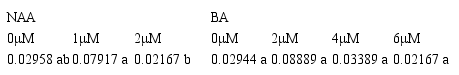 For BA, there was no significant difference among the treatments. These results indicate that the addition of NAA or BA to the culture medium did not influence the leaves length after 30 days of culture, probably due to a satisfactory endogenous level of these regulators in the explants.