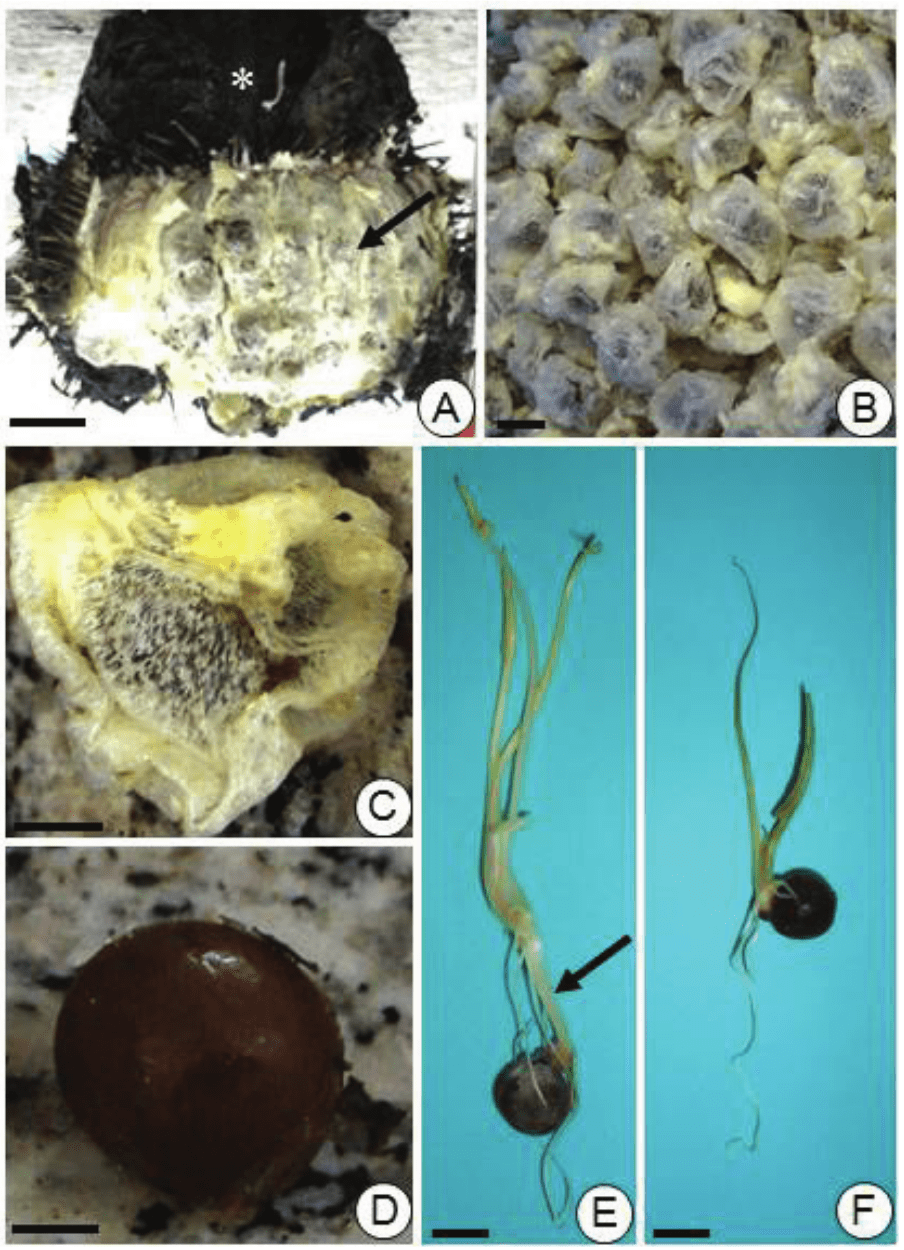The seeds are hard, globular shape and surrounded by a white bag, probably aryl (Figure 1B-C); without the white bag the seed shows dark brown color (Figure 1D). They are placed along the main axis, featuring axial placentation, and to develop involved in pulp. The embryo has two cotyledons, one developed and the second stunted. The embryo is placed in the hilar region, surrounded by whitish reserve tissue. The length of the seeds was 10.6 (± 4.0) mm, and the width was 9.8 (± 0.6) mm. The thousand seed weight was 392.9 (± 11.5) g. The water content in the seeds immediately after extraction from the fruits was 44.8%.