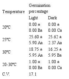 Germination was slow and non-uniform, once the first seeds germinated at 60 days after treatment was initiated, and germination was observed for approximately 170 days. At 25°C promoted higher percentage germination, regardless of the lighting conditions. At 30°C, germination ranged from 16.25 to 18.75%, with statistically similar results to those obtained for the best germination temperature. Temperatures of 20 and 20-30°C were inadequate, showing no success in germination (Table 1).