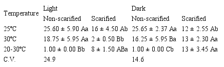 The experiment was designed in a factorial 4 x 2 (temperature and light condition) and 3 x 2 (temperature and scarification). We used a completely randomized experimental design, and the data were analyzed using ANOVA, followed by Tukey’s test at 5% probability.