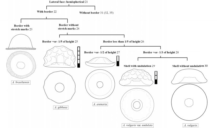 Remarks: Lateral face, hemispherical shell, rounded with depressions, presence of a small border on the extremity of the shell. Dorsal face, shell forming five vertices and depressions. Ventral face, circular shell with pseudostoma circular and centered.
