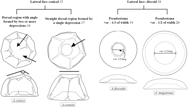 Remarks: Lateral face, shell oval and high, with invaginated buccal tube. Ventral face, circular shell with two concentric circles, the outer one corresponds to the junction of the buccal tube with the lateral shell and the inner one is the circular pseudostoma, which may present lobes, and centered.
