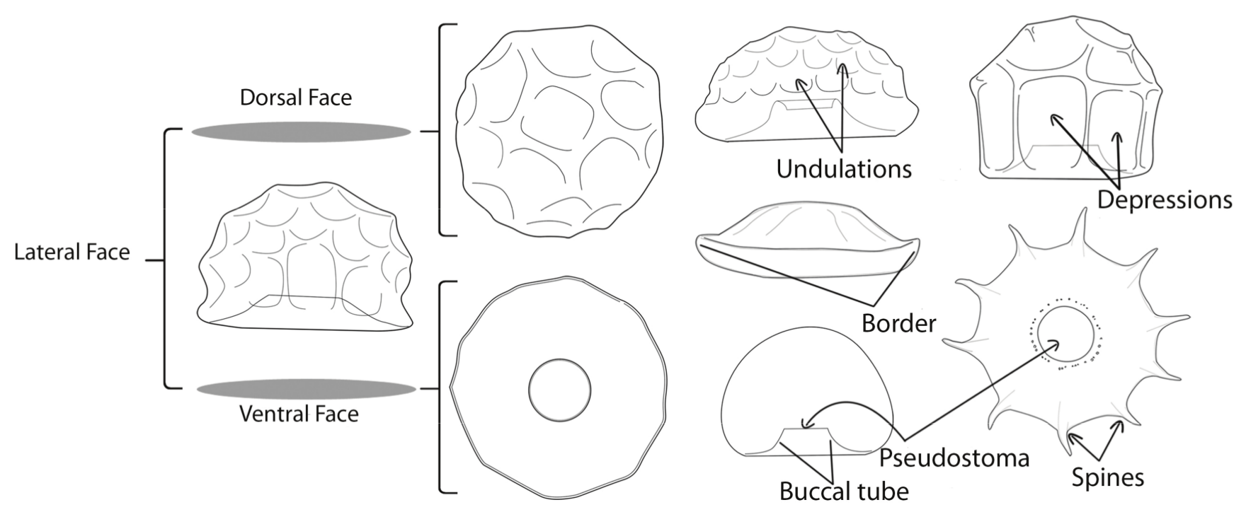 Remarks: Lateral face, hemispherical shell, domed with slight undulations on the surface, with a flap on the shell base, and a small, invaginated buccal tube. Ventral face, circular shell, circular and central pseudostoma, pores present around pseudostoma.