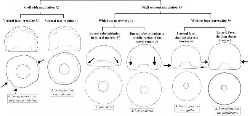 The first characteristics used for the main division and classification of 23 taxa of Arcella in pictorial key were pseudostoma form (lobes or circular) and the position of the buccal tube (internal or external). To highlight the difference between some taxa with similar characteristics, we used proportion of shell measurements (Figure 4 and 5).
