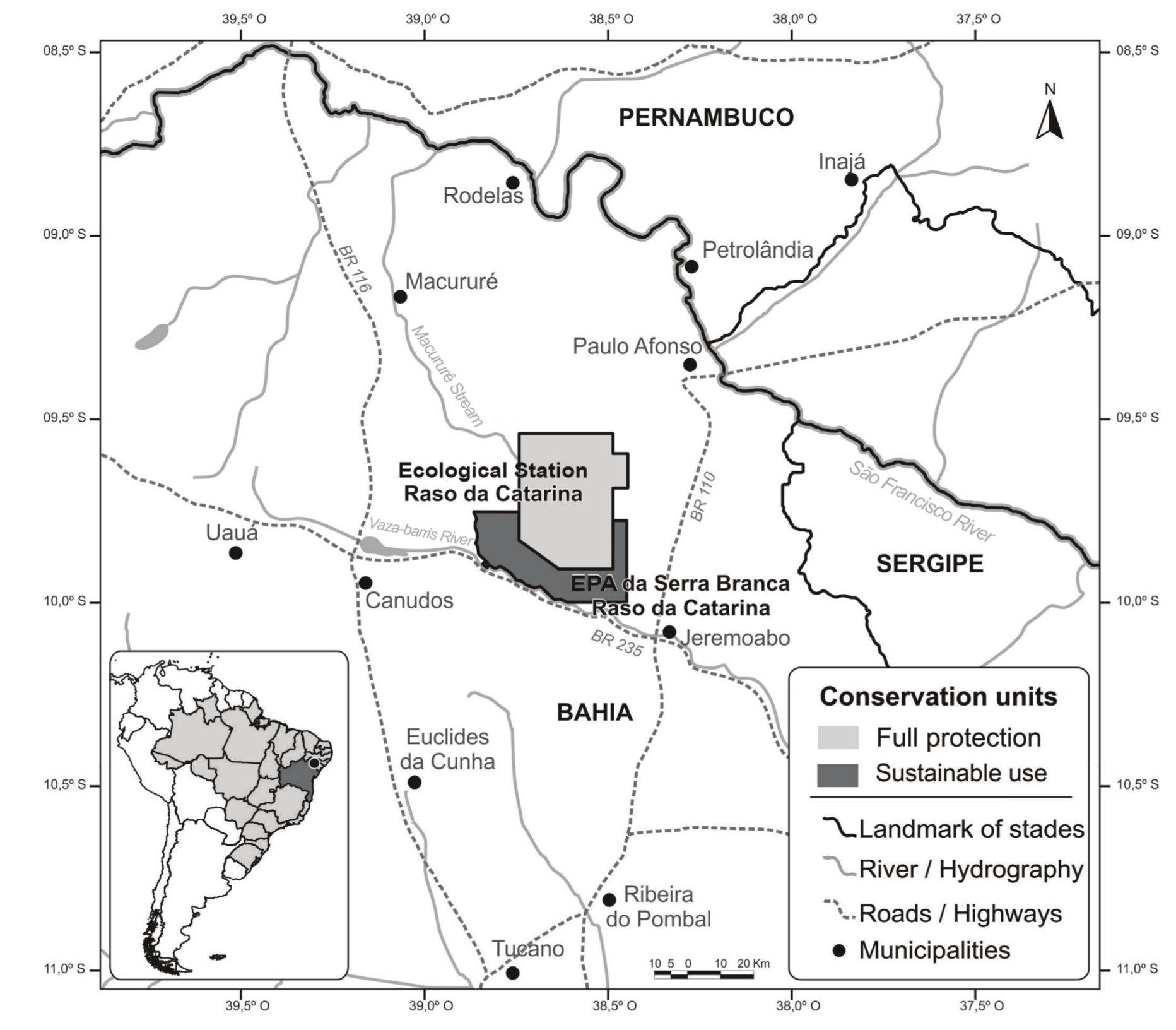 The Evironmental Protection Area Serra Branca, Raso da Catarina (EPASB, Figure 1) comprises 67,237 ha, located in the municipality of Jeremoabo in Northeastern, in the State of Bahia, and it is fully inserted into the “polígono das secas” (Fundação CTI/NE, 2016), delimited by the coordinates 09º53’15.5’’ to 09º44’34.6’’S and 38º49’36.1’’ to 38º52’20.4’’W, limited to the South with the Vaza-Barris River and North to the Ecological Station Raso da Catarina (ESRC). The predominant vegetation is the sandy, very dense bushy Caatinga. The climate of the Ecoregion is semiarid, with average rainfalls of 500 mm year-1 and annual temperature is approximately 23ºC (Szabo, Rocha, Tosato, & Barroso, 2007). The soils are generally sandy deep and very fertile relief plan with sandstone formations (Velloso, Sampaio, & Pareyn, 2002).