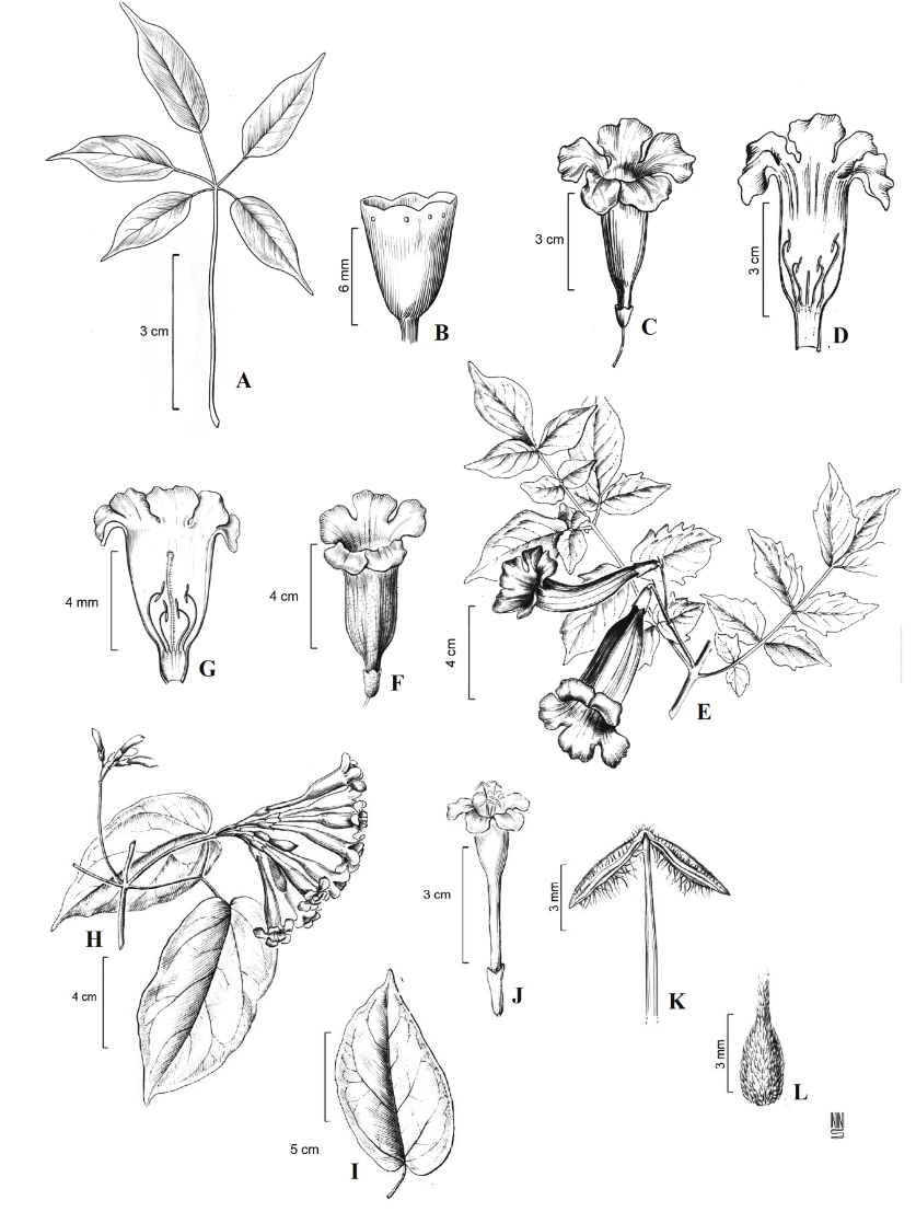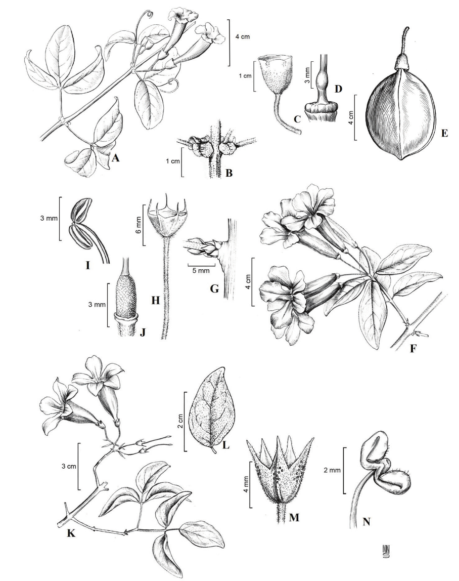 2. Bignonia convolvuloides (Bureau & K. Schum.) L.G.Lohmann, Ann. Missouri Bot. Gard. 99: 418. 2014. Figures 2.B, 3.F-J