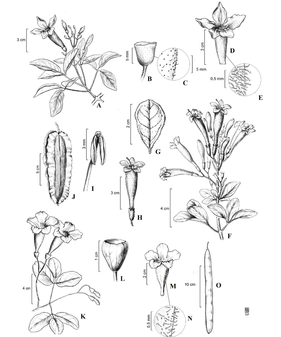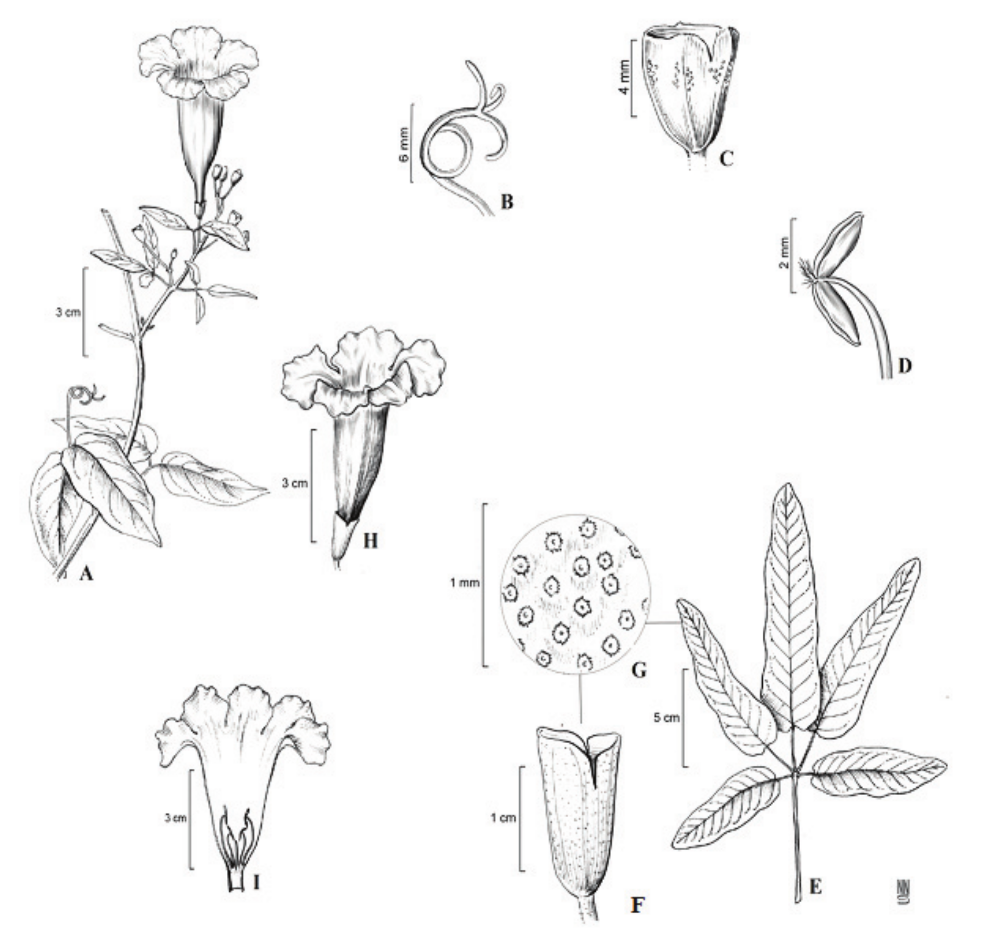 Trees, shrubs or lianas. Branches commonly cylindrical to quadrangular or hexagonal. Leaves opposite, rarely verticillate or alternate, composite, 2-3-foliolate, ternate, pinnate, bipinnate or digitate, rarely simple, entire, crenate or serrate, venation pinnatinerved to palmatinerved; in lianas terminal leaflet can be substituted by tendril (simple, bifid, trifid or multifid). Inflorescences racemose or tirsoid, terminal, axillary or cauliflorous. Flowers generally large and showy, dichlamydeous, pentamerous, zygomorphic, bisexual. Calyx gamosepalous, campanulate, tubular, spathaceous or urceolate, apex spatulate, bilabiate, truncate or 2-5-lobed, aestivation imbricate, with or without patelliform nectaries. Corolla gamopetalous, tubular-campanulate, infundibuliform, campanulate or hypocrateriform, sometimes with bilabiate apex, aestivation imbricate, zygomorphic; stamens included or exserted, 4, rarely reduced to 2, didynamous, staminode reduced, glabro, rarely elongate and pilose; filaments adnate to the corolla at the base; anthers commonly divergent, generally glabrous, rarely pilose; pollen grains many, in monads, rarely in tetrads or polyads; nectariferous disk generally present; gynoecium bicarpellate, bilocular; ovary superior, multiovulate, placentation axial, stigma bilamelate, lobes sensitive (closing after contact with pollinator). Fruit capsule usually dehiscent, septifragal or loculicidal, rarely indehiscent; seeds usually winged, rarely without wings (Woodson et al., 1973; Gentry, 1980; Lohmann, 2004).