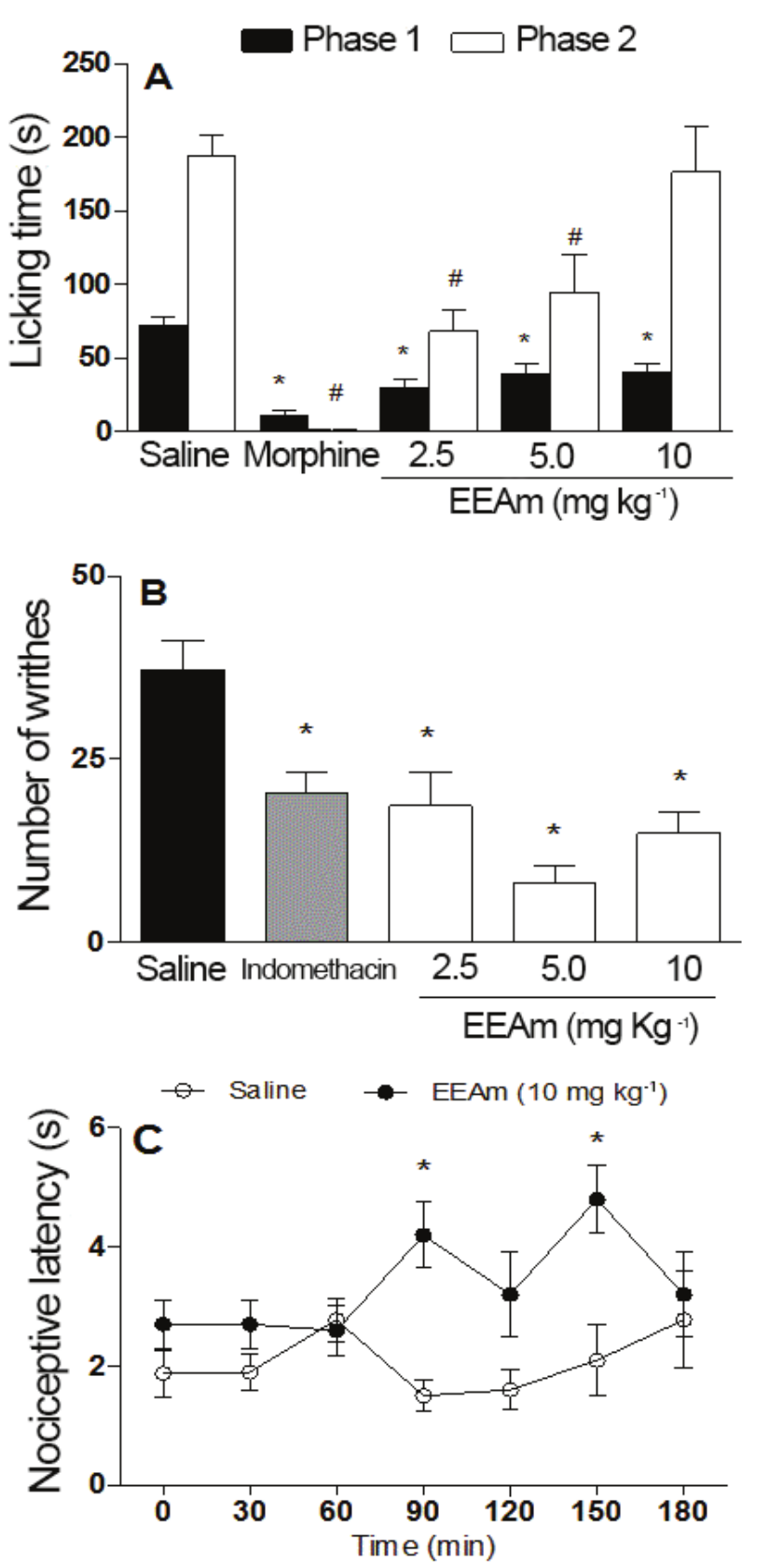 Formalin: Formalin (20 μL 2.5% v v-1.) was injected by subcutaneous (s.c.) route in the right hind paw of mice and the time (s) that the animal spent licking paws was recorded at initial or neurogenic (Phase 1: 0-5 min) and late or inflammatory (Phase 2: 15-30 min) phases (Hunskaar, et al. 1985). Animals were treated with saline, EEAm or morphine (5 mg kg-1; s.c.) 30 min before formalin.