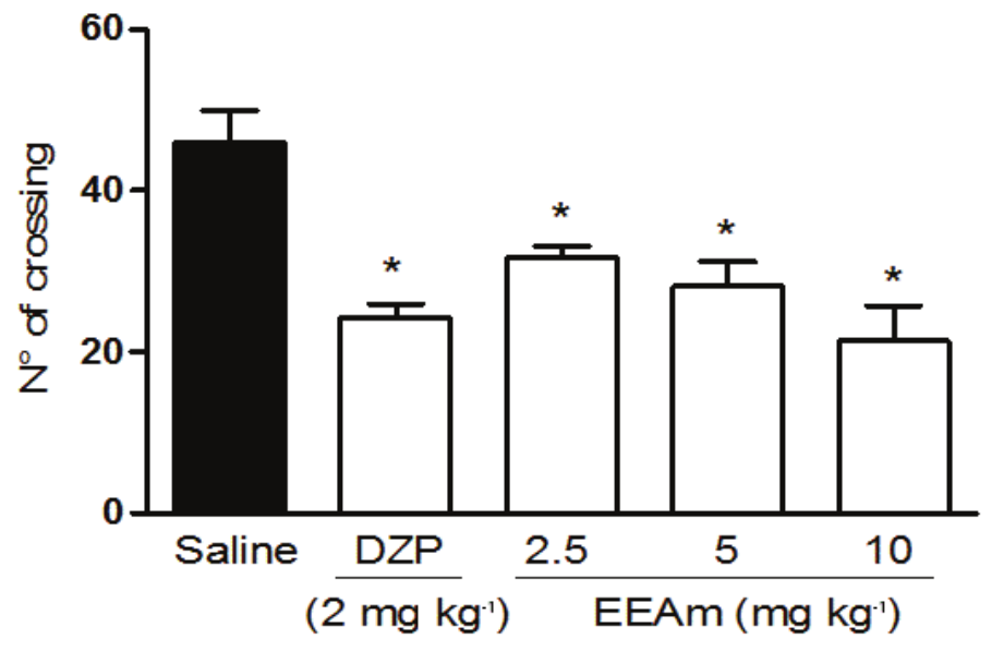Based on the demonstration of the neurogenic effect of EEAm, other probable central actions were investigated. In the open field test, EEAm reduced the number of crossing at all doses: 2.5 mg kg-1 (31.71 ± 1.47) by 31%, 5 mg kg-1 (28.14 ± 3.09) by 38% and 10 mg kg-1 (21.33 ± 4.40) by