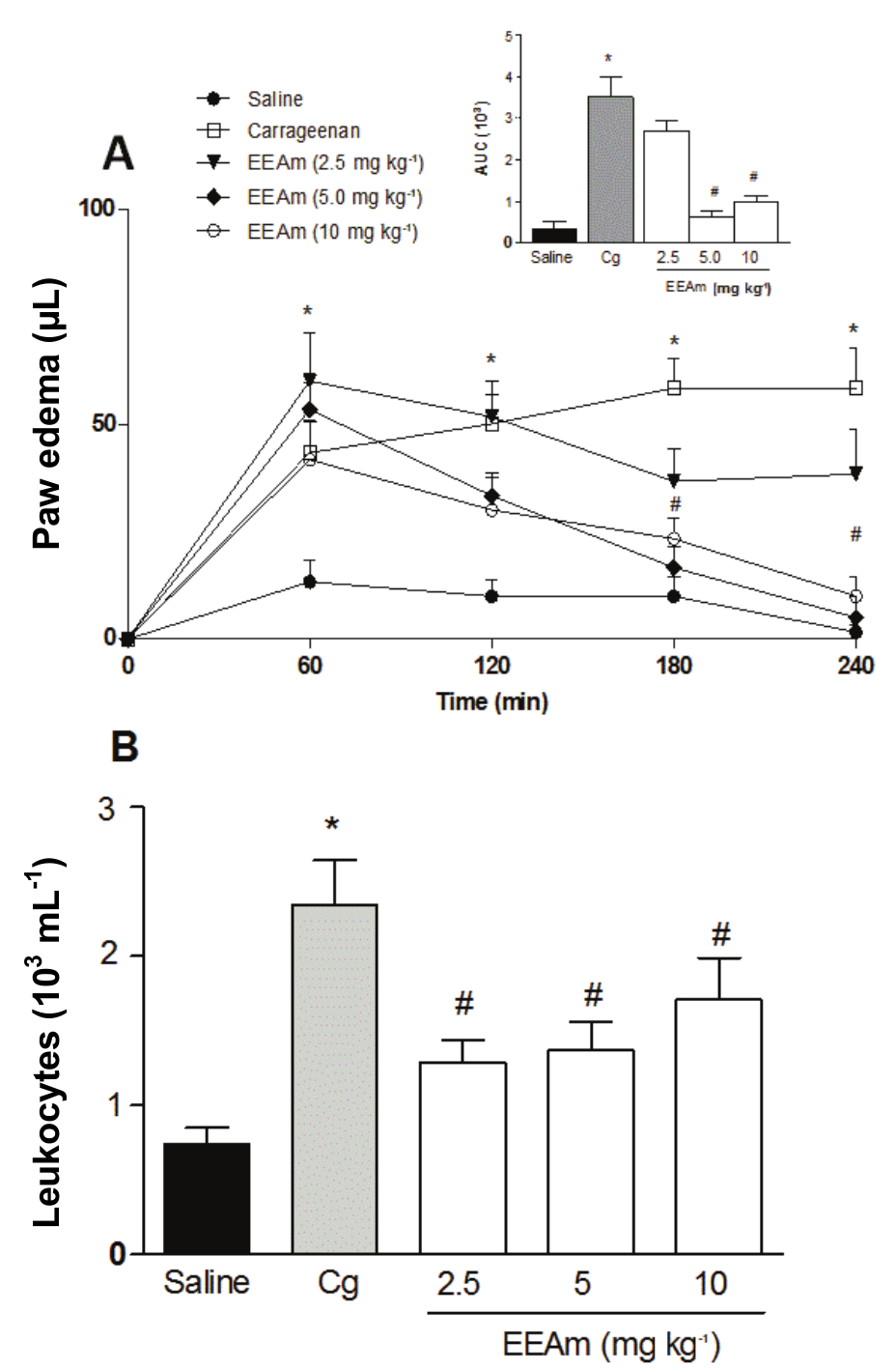 EAm (2.5, 5 or 10 mg kg-1) was dissolved in sterile saline and administered i.p. in mice, 30 min before the inflammatory agent carrageenan (1%; s.c.), for evaluation of its anti-inflammatory activity in the models of paw edema and peritonitis. Control animals received saline (v v-1; 0.1 mL 10 g-1 body mass) in substitution of EEAm.