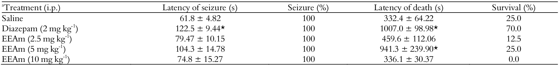 Seizures: Mice received pentylenetetrazole (PTZ; 85 mg kg-1; i.p.) and the latencies to the first seizure and to death (anticonvulsant response) were evaluated during 20 min (Erdogan, Golgeli, Arman, & Ersoy, 2004). Animals were treated with saline, EEAm or diazepam (2 mg kg-1; i.p.) 30 min before pentylenetetrazole.