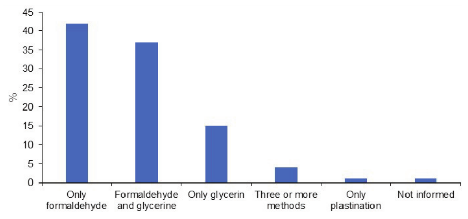 The Figure 1 shows the main methods of conservation for cadavers. It can be observed that 42% of surveyed medical schools make use of only formaldehyde, 37% make use of formaldehyde and glycerine, 15% make use of only glycerin, 4% adopt three or more methods, 1% makes use of only plastination, and 1% did not inform.