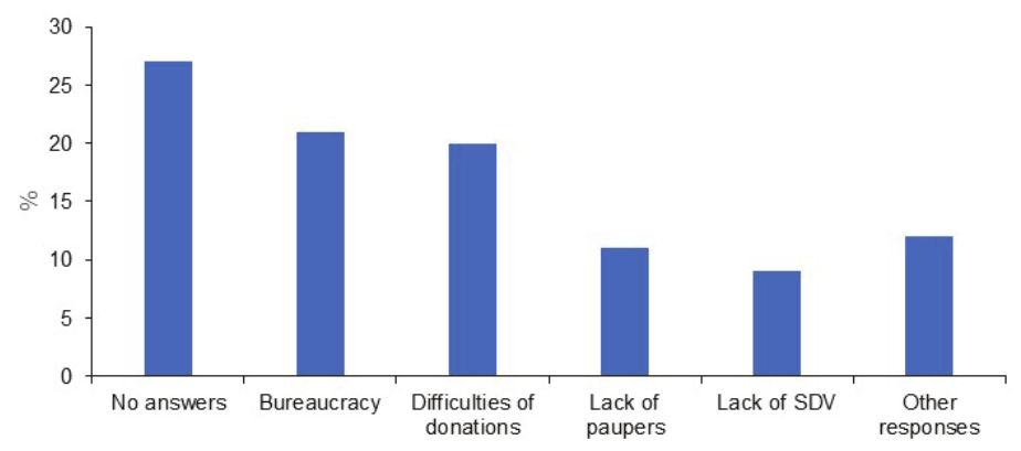 The Figure 2 shows the main answers obtained by our research on the difficulties faced in obtaining human cadavers for teaching. As shown in the Figure 4, the bureaucracy was the main difficulty reported by 21% of responses. 20% of the faculties reported to face difficulties with the donations of cadavers, 11% cited a lack of paupers, 9% reported lack of service of death verification (SDV), 12% reported other responses, and 27% gave no answers.