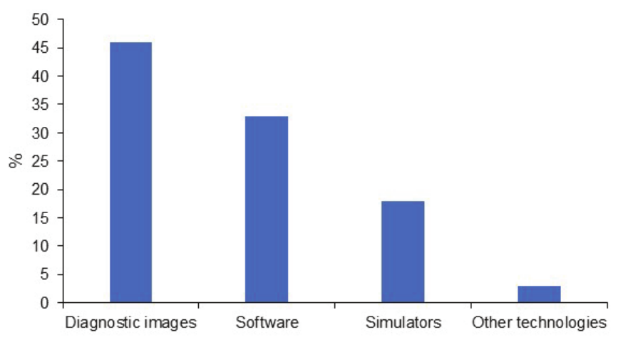 The Figure 4 shows the distribution of answers about which technologies are used in the practical lessons of human anatomy. The Figure 4 shows that 46% of faculties make use of diagnostic images, 33% make use of software, 18% make use of simulators, and 3% make use of other technologies.