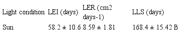 Plants grown in sun and shade conditions did not show differences in LEI and LER. However, shade plants had a significantly longer (p < 0.05) LLS when compared with sun plants (Table 1).