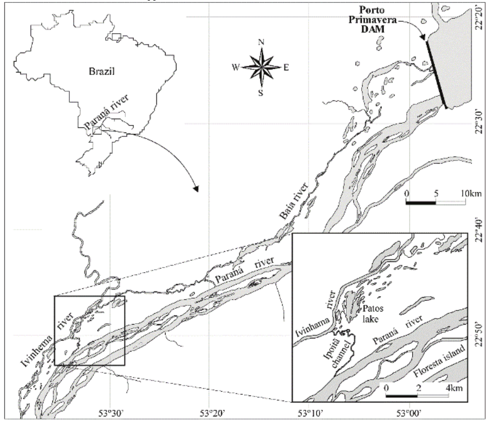 The study site is the Ipoitã Channel (22° 50'S; 53° 33'W), located in the Upper Paraná River floodplain, which connects the Ivinhema and Paraná rivers, with an average depth of 3.2 m. Samples were taken at three different sampling sites in this channel: site 1 at the connection with the Paraná River, site 2 in the middle of the channel, and site 3 at the connection with the Ivinhema River (Figure 1). This channel is inserted in the state of Mato Grosso do Sul, although it is practically on the border with the state of Paraná.