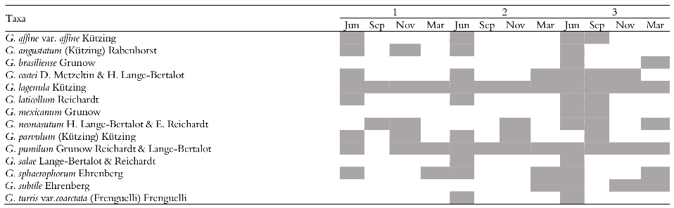 In this study, only Gomphonema neonasutum is the first record to the state of Paraná (Table 1). The species that have been widely distributed was G. lagenula and G. parvulum. Only Gomphonema lagenula Kützing, a species with cosmopolitan distribution, occurred in all sampling sites and in all months.