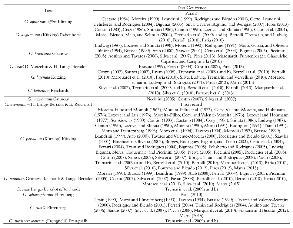 Almost 22 species of Gomphonema have been recorded for aquatic environments in Paraná (Tremarin, Freire, Bertolli, & Ludwig, 2009b), and only four species for Mato Grosso do Sul. The present study is the first floristic survey of Gomphonema in the Paraná River floodplain, contributing to the knowledge and characterization of aquatic biodiversity in this region, including ecology and biomonitoring studies, for which the correct identification of taxa is essential.