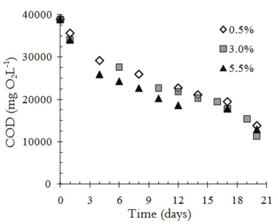 There was no significant difference in COD reduction between the three inoculum concentrations used, reaching a mean of 68 ± 3%, with COD reducing a little between the 5th and 12th day. According to Von Sperling (2007), the reductions in vinasse BOD must be around 70%, a value close to that found for COD reduction of the effluent that underwent microbial degradation, indicating reduction, in its majority, of the biodegradable part.
