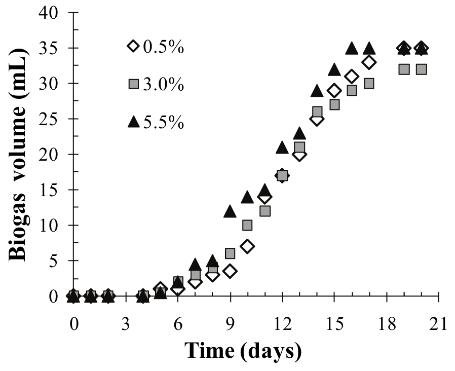 The control pH was 7.0 ± 0.5 and a negative variation (ΔpH < 0) indicated a drop, making the environment more acidic. Anaerobic digestion can be summarized in four phases: hydrolysis, acidogenesis, acetogenesis and methanogenesis (Patil et al., 2012, Costa, Barbosa Filho, & Giordano, 2014), where acidogenesis is the process in which there is the formation of organic acids that cause a sharp decline in the pH of the medium, helping to promote then the acetogenesis, which forms the main quantities of substrates necessary to the last step, the methanogenic, of methane production. Acidogenesis ceased after the 3rd day. Biogas production started from the 6th day, just after the end of the acidogenesis, being the production almost similar in the three concentrations studied, as shown in Figure 2.