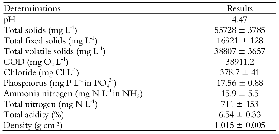 Results of physicochemical analyses are listed in Table 1 and show that vinasse has all of the harmful characteristics to the environment, as cited by Freire and Cortez (2000) and Lora and Andrade (2009), as high COD, low pH and high total solids content.