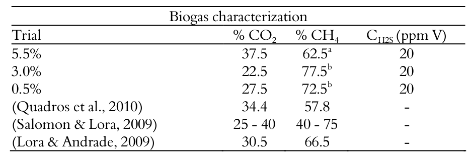 The characterization of the biogas formed can be visualized in Table 2. It should be noted that the Alfakit biogas kit performs the quantification of CO2 and does a 100% subtraction to find the value of CH4, disregarding the 5% relative to other components, such as ammonia, hydrogen sulfide, hydrogen, water, oxygen, among others (Oliver et al., 2008, Salomon, & Lora, 2009, Patil et al., 2012, Costa et al., 2014). The values found are not far from those mentioned in the literature, especially regarding the CO2 content. There was a statistically significant difference between the trials with the lowest and the highest (5.5%) concentrations of manure. Differences associated with biogas production, as well as composition may occur when using a very low or very high substrate/inoculum ratio (De Vrieze et al., 2015).