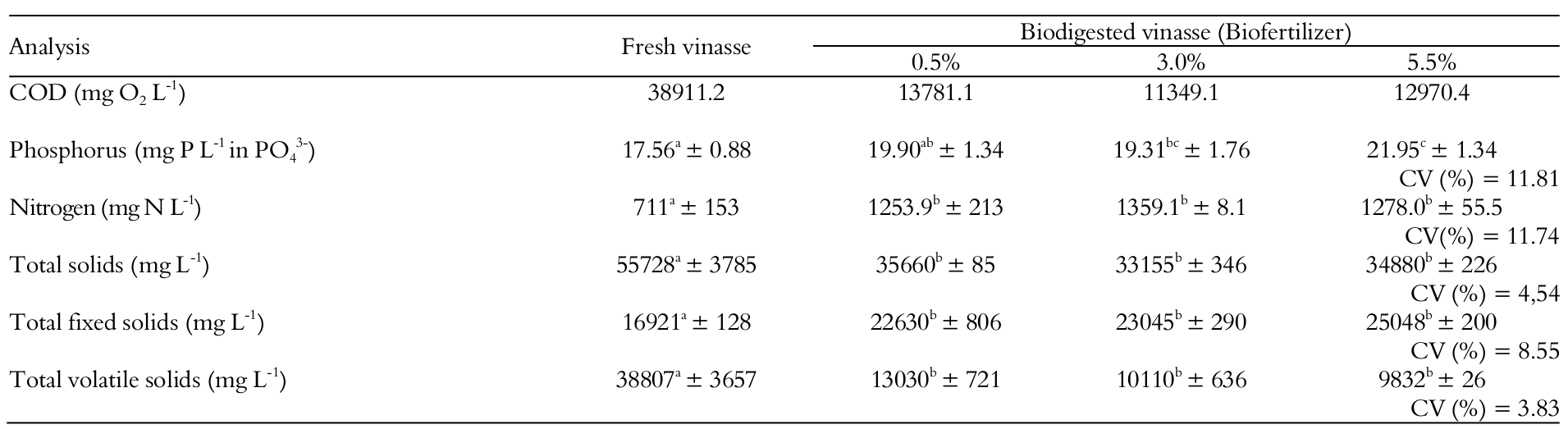 Physicochemical analyses performed in the biofertilizers consisted of chemical oxygen demand (COD), total fixed and volatile solids, phosphorus and total nitrogen content, according to the aforementioned methodologies in the characterization of fresh vinasse.