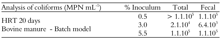 Amaral et al. (2004) used bovine manure in a Chinese digester and observed in a 20 day-HRT, 2.4.104 MPN mL-1 total coliforms and 4.7.103 MPN mL-1 fecal coliforms in the biofertilizer. Orrico Junior et al. (2009), in a 22 day-HRT with swine manure in an Indian model, verified 4.6.104 to 1.1.105 MPN mL-1 total coliforms and 1.5.104 to 1.1.105 MPN mL-1 of fecal coliforms in the biofertilizer. Quadros et al. (2010), in an ongoing process using a Canadian biodigestor with sheep and goat manure, reached above 98% reduction in 20 day-HRT.