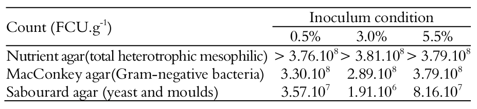 Table 5 lists the results obtained from the plate counts for the sludge sample on the surface of the biodigested effluent, indicating that the behavior of the three tests did not diverge. In the nutrient agar medium, the dilutions of the order of 10-6 were insufficient to make a plate count, and the maximum value was extrapolated. For both MacConkey and Sabourard agar, results were obtained at 10-6 dilutions. This information can be important, since an analysis of the population diversity was not possible, at least, the concentration of groups (total heterotrophic mesophilic, Gram-negative bacteria and yeast and molds) is presented.