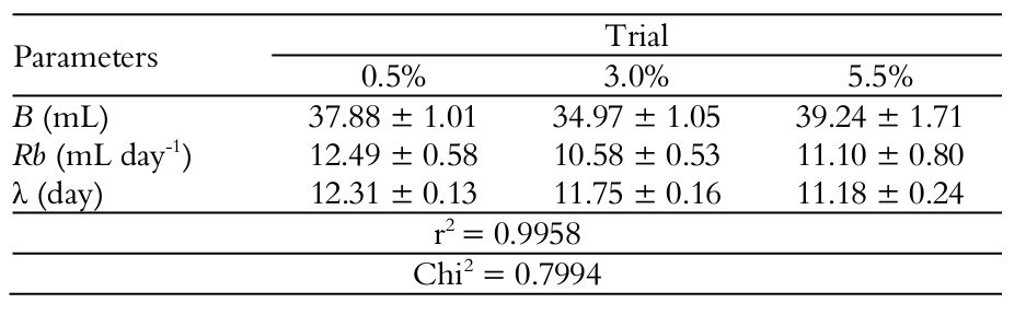 The regression of the modified Gompertz equation modeled efficiently the biogas production during biodigestion, providing the parameters of the equation and coefficients of determination (r2) and contingency (Chi2), as shown in Table 6.