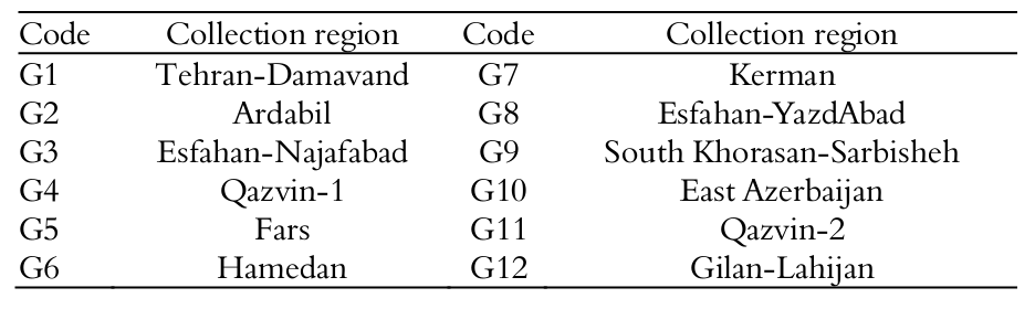 In this study, the seeds of 12 lemon balm ecotypes were provided by National Center for Genetic and Biological Resources of Iran, and each ecotype were planted (ten plants per plot) in randomized block design with three replications during 2015 year. Ecotype name, their parentage and releasing centers are given in (Table 1). The data of morphological characters of lemon balm ecotypes which were collected include: Days to 50% flowering (DF), Plant height (PH), Stem diameter (SD), Number of branches per plant (NB), Internode length (IL), Leaf length (LL), Leaf width (LW), Number of nodes (NN), Fresh weight (FW), Dry weight (DW) and Essential oil percentage (EOP).