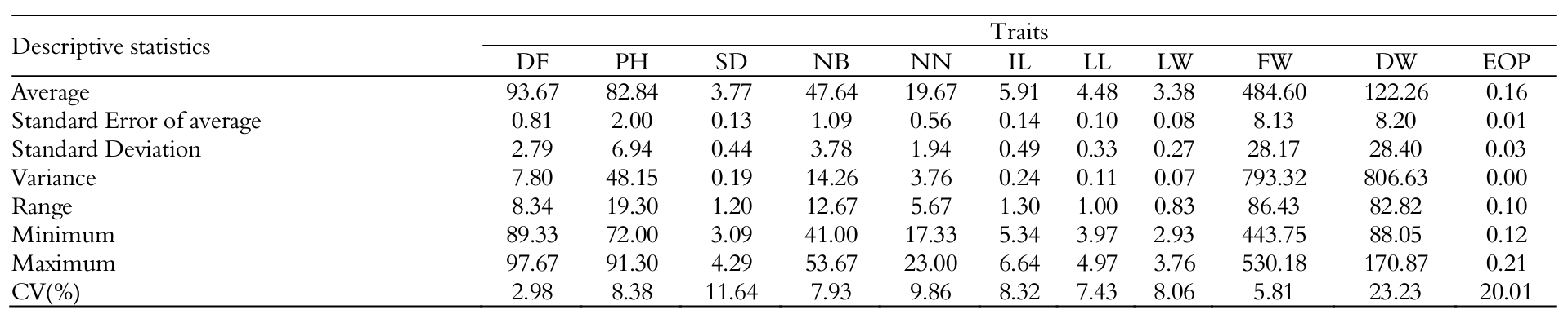 Minimum, maximum, average, standard deviation and coefficient of variation to phenotypic traits are shown in Table 2. According to Table 2, for all evaluated traits, considerable variation among ecotypes was observed. Most of the phenotypic variation among different traits related to ‘DW’ and ‘EOP’ traits in the amount of 23.23 and 20.01%, respectively. So, we can say about these traits that there are plant genetic resources for use in breeding programs to improve these traits. The lowest observed variation among traits was for ‘DF’. Phenotypic variation coefficient ranged between 2.98 to 23.23% for different traits.
