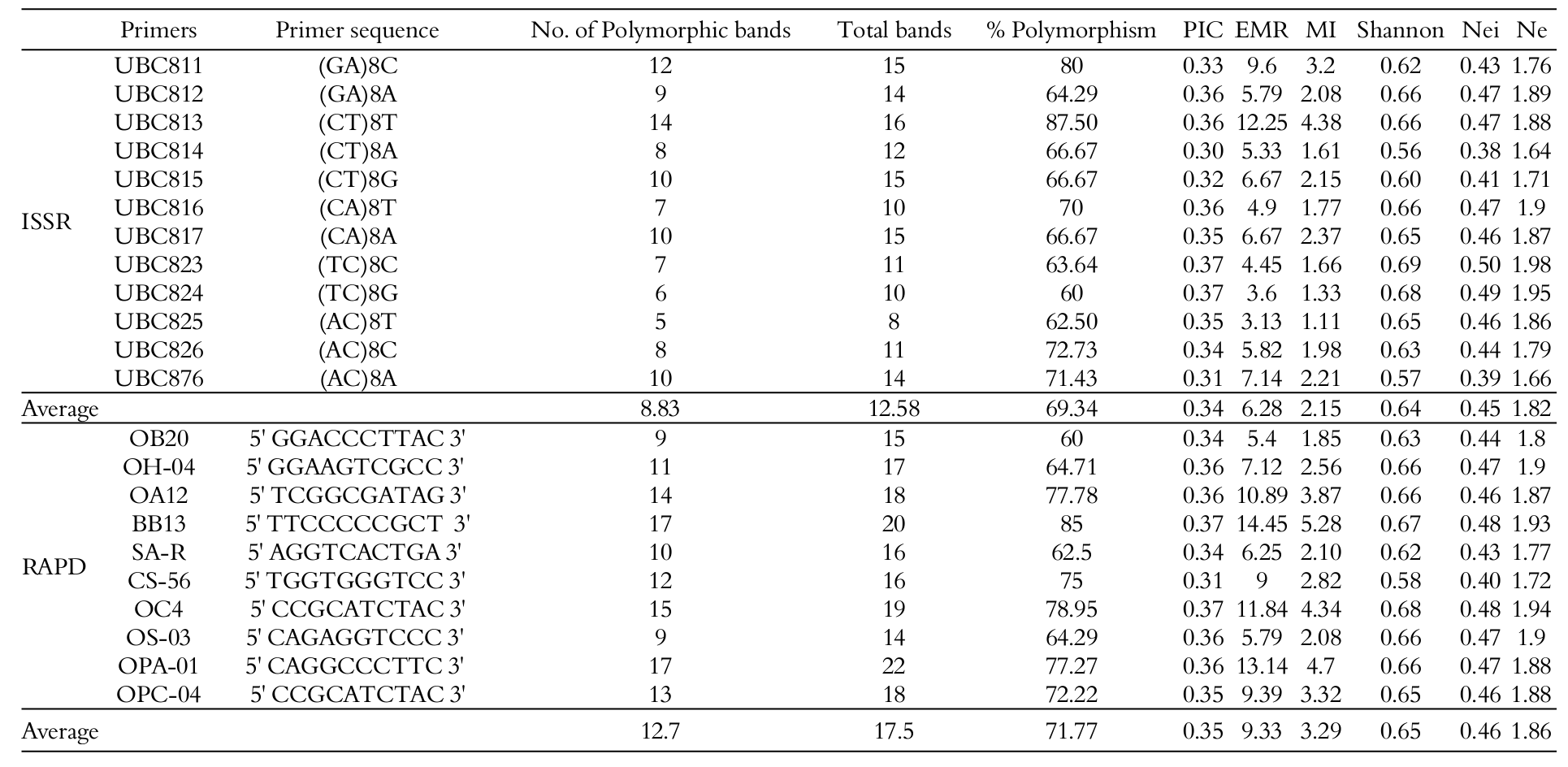 The first, second and third leaves from a branch at seedlings stage were used for the DNA extraction, according to the protocol of Murray and Thompson (1980). The quality and quantity of the extracted DNA was checked using 1% agarose gel electrophoresis and spectrophotometer, respectively. 20 ISSR primers from the University of British Columbia-UBC (Canada), were applied and only 12 of them (Table 3) were amplified and showed polymorphism. Also, 15 RAPD primers were applied; only 10 of them (Table 3) were amplified and showed polymorphism.