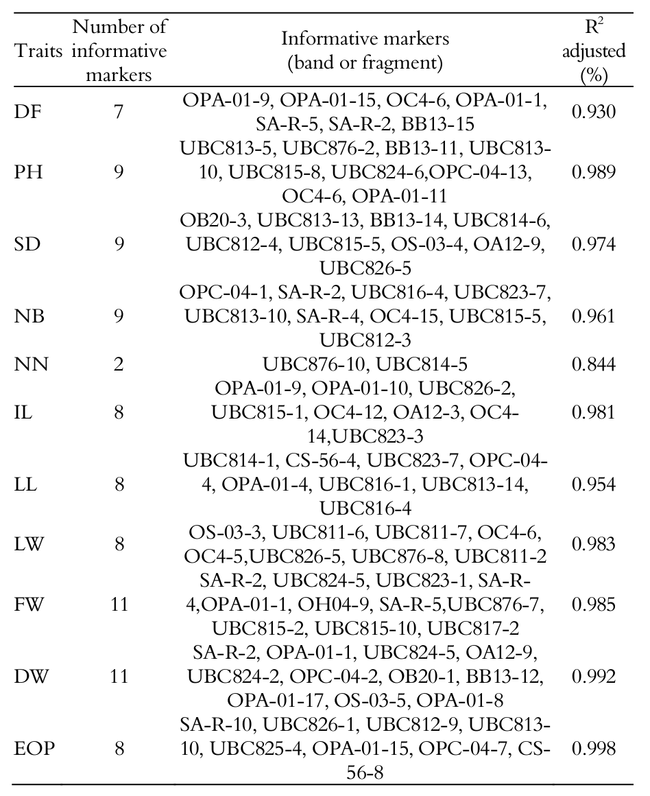 The results of stepwise regression analysis revealed a significant association between the traits and some of the studied loci (Table 4). In stepwise regression traits and markers were considered as the dependent variable and the independent variables, respectively. A total of 90 markers (alleles) that were significantly correlated and associated with studied traits, entered the model which some of the markers were involved of few traits and finally 71 markers were effective in phenotypic variation of traits. Other markers have no significant effect on model and therefore we can say that these correlated markers can be used to identify superior genotypes in terms of studied traits. The markers identified were varied from two markers for number of nodes to 11 markers for fresh weight and dry weight. These markers were negative or positive correlated to traits. Other researchers are using regression analysis to identify the relationship between markers and studied traits and used them in breeding program (Rakshit et al., 2010, Basaki et al., 2011, Khadivi-Khub, 2014, Marsafari et al., 2014, Ipek, Seker, Ipek, & Gul, 2015).